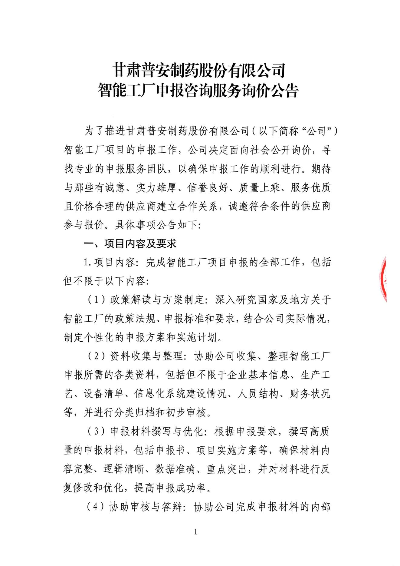 甘肅普安制藥股份有限公司智能工廠申報咨詢服務詢價公告